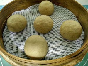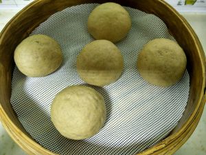 用双手在面团下部搓高,搓圆。下面垫上油纸,放入冷水的蒸锅中。醒发30分钟。