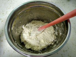 浸泡好的酵母水放入盆中,加入准备好的面粉,揉吧!呈现这个状态即可。