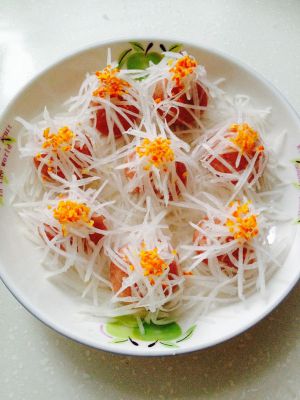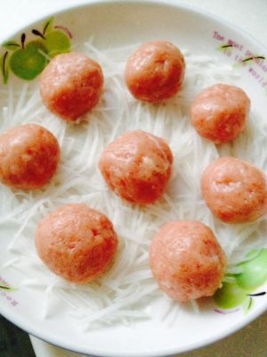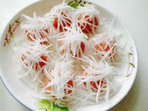 盘子里撒铺上一层白萝卜丝,团圆的肉丸放上面。