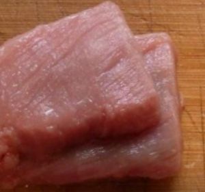 里脊肉逆纹切1cm厚大片, 用大錾刀俩面拍松几乎至.5cm。