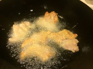 锅中倒适量油,放水裹好全蛋糊的里脊肉,要一条一条的放入,炸至发白捞出。注意,炸一部分捞一部分,不要一下全倒进锅里