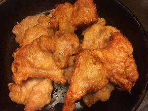 炉上油锅烧至7成左右炸, 不要着急, 一次2-3块。 有些金黄色就捞起。