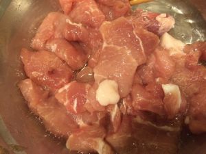 肉片放个盆里, 放盐料酒腌制(铺底味)10分钟左右。