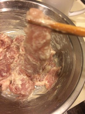 加蛋清, 芡粉, 面粉,用筷子搅拌, 如果太费劲, 加少许水。 肉上有足够的挂糊, 而搅起来也比较轻松就好。