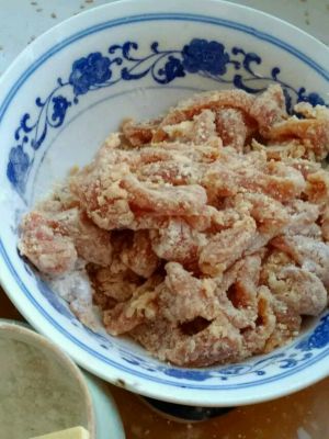 腌制入味后抓一层干淀粉,然后再抓一层湿淀粉,抓匀后再来一把干淀粉,让肉条一根根分开。