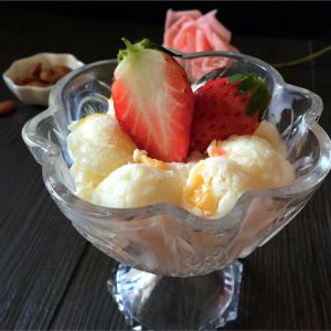 我是晚上做好第二天中午吃的,用勺子舀起直接吃或者用挖球器挖出放到冰淇淋杯中,搭配自己喜欢的水果味道棒棒哒,比外面买的好吃很多呢,奶香味十足。春日以致夏天还会远吗?