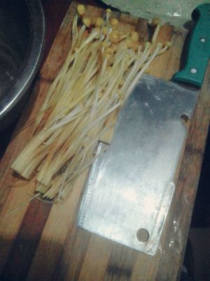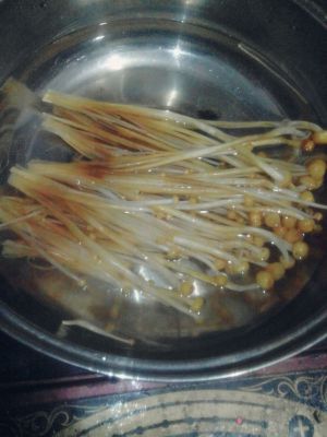 水开金针菇下锅焯一下水,一分钟左右,这样的金针菇口感脆脆的,时间久了金针菇就煮老了,不好吃了。