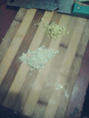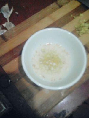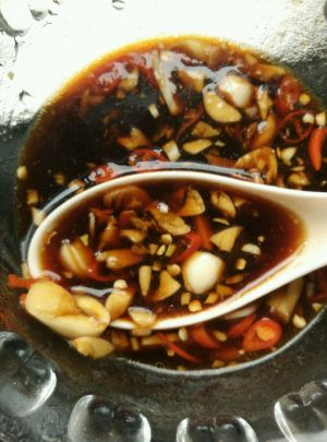 调汁:大蒜子小米辣切碎,放在碗里,加人生抽醋香油鸡精盐白糖。搅拌均匀。