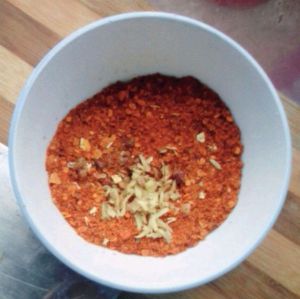 把辣椒面,花椒,第二份姜蒜,桂皮茴香八角碾碎放进碗里,可以加少量盐