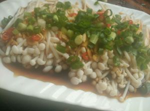 把热油浇在金针菇的葱花上。就好了。不管冬天夏天都非常清爽可口。