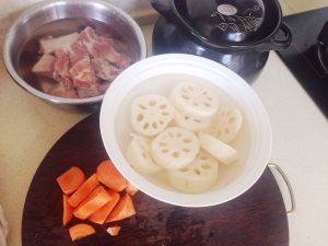 备材料,排骨泡去血水,藕切断放入清水中防止变色,胡萝卜切滚刀块。