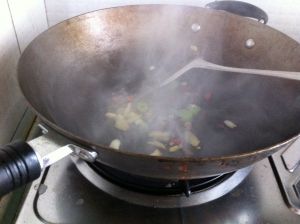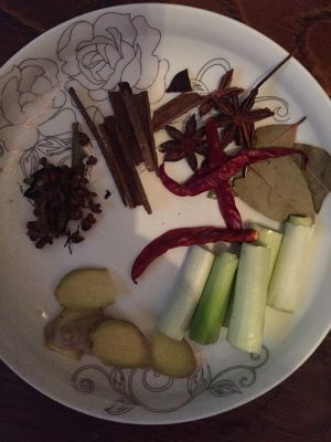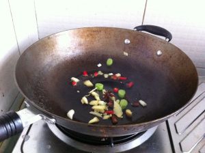 锅中入蒜,姜,八角,红辣椒等爆香