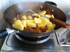 30分钟后、加入土豆,再用中火煮10分钟、然后加入味精,把青椒放进去、青椒熟了就可以起锅了