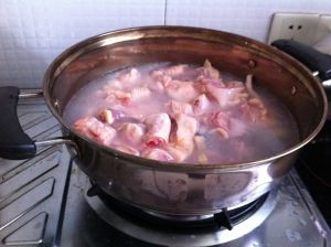 鸡入加入姜片的沸水去血水