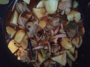 加入洋葱翻炒,然后加啤酒没过鸡肉,然后加入土豆,少许盐和酱油