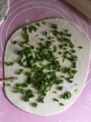 (1)开水少许把盐融化,再倒入面粉盆用筷子搅拌成絮条用手揉成光滑面团 (2)封上保鲜过十五分钟后取出,撒少许面粉揉成团擀成薄皮 (提前洗好切碎的葱末倒入少许芝麻油拌匀,然后用筷子把葱末均匀涂在面皮上)