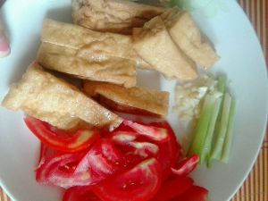 把豆腐干对半开、番茄切片、蒜切末、葱切段,把酱油、蚝油、砂糖少许放入一个碗内调好备用。