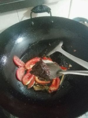 开火放油接着放蒜末、葱段炒出香味,然后放番茄几下放入豆辨酱一勺,接着炒,这时候加点水没过番茄。