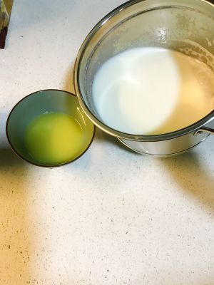 加热好的牛奶加入喜欢甜度的白砂糖,我加黄砂糖的。然后顺着碗倒入,慢一丢丢,轻柔一点,轻柔一点 轻柔一点