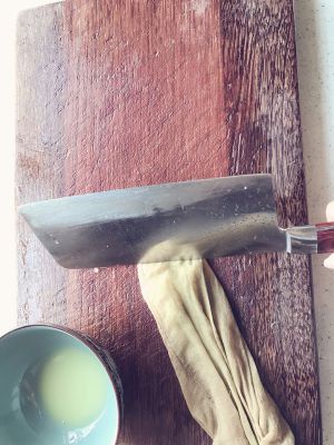 每榨出一次姜汁后,用刀背切打几下再榨,更加容易出姜汁。