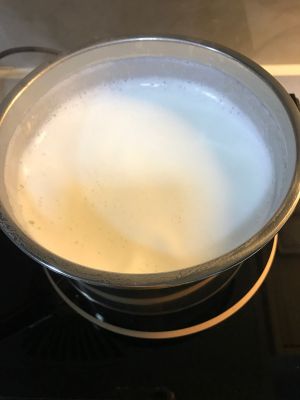 鲜牛奶放锅里煮沸腾,加入细砂糖搅拌几下马上关火。关火后千万不要再搅拌,牛奶静止放置5分钟。