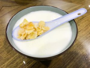 一碗香喷喷的姜汁撞奶完成了,再放一小把玉米片装饰就可以食用了。