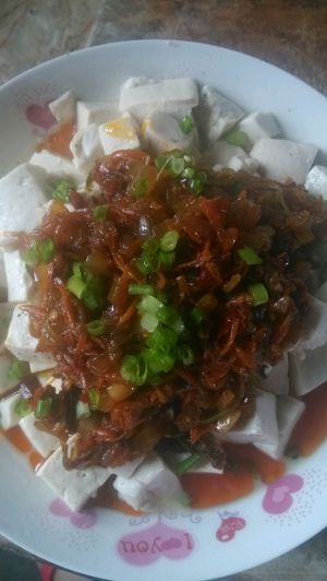 辅料倒在豆腐上 撒上葱花 吃时拌匀