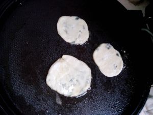 不粘锅上放少许玉米油,中大火,放上饼胚,可以盖盖(闷一下会比较软),观察并及时翻面,我都不用铲子,筷子就搞定