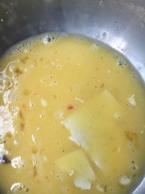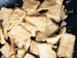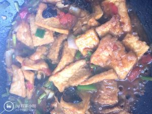 油炸豆腐盖在配菜上,再把勾兑的料汁浇入翻炒均匀,这时按个人口味,如觉得味淡可以稍微加盐,加水炖(要是有高汤更好)