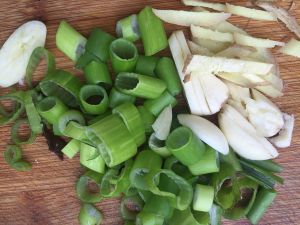 葱姜蒜切粒,青椒和胡萝卜切片(红椒,木耳都可以)。