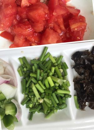 豆腐切大小一厘米左右的块,番茄去皮切和豆腐大小的块,姜蒜切片,葱头切片,备用