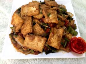 豆腐切长方形快,大约后2、宽4、长5厘米,并用冷水泡10分钟左右,为的是去豆腥及炒制时不容易破