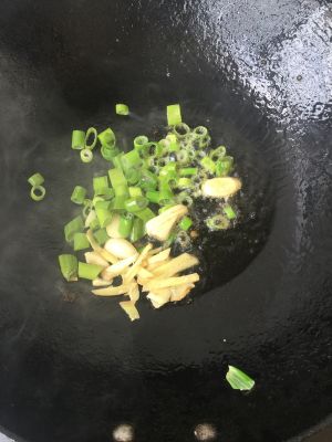 另起锅倒入适量食用油,放入葱姜蒜粒爆香,加入配菜翻炒至断生。