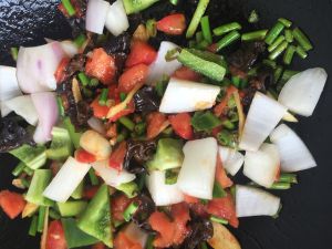 把配菜按成熟快慢一次进锅,大约炒1分钟