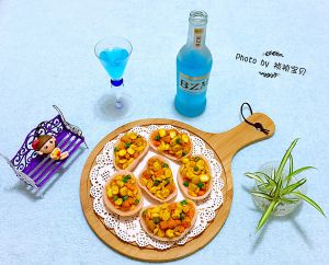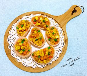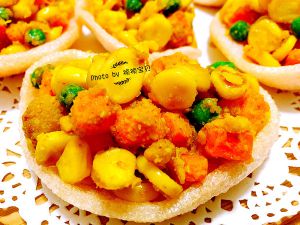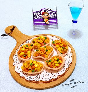 炒好的金沙玉米和胡萝卜、青豆装入虾片中