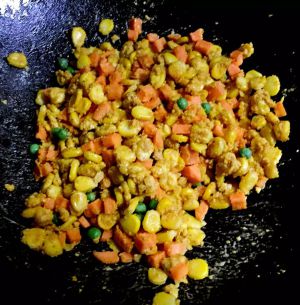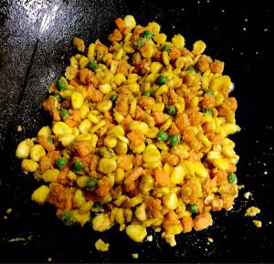 玉米青豆入热油锅炸熟,开始下锅时不要搅动,玉米上的淀粉容易脱落。