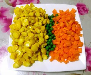 准备原材料玉米粒、胡萝卜切丁、青豆