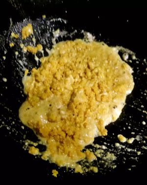 锅里倒油烧热加捣碎的蛋黄,想偷懒以为锅里捣蛋黄省事,结果太费劲也没把蛋黄捣成想要的细沙状。