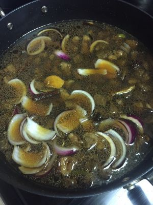 加入洋葱后进行翻炒,随后加入清水后大火烧开,水要稍微多一些,烧开后改为中火炖牛腩。