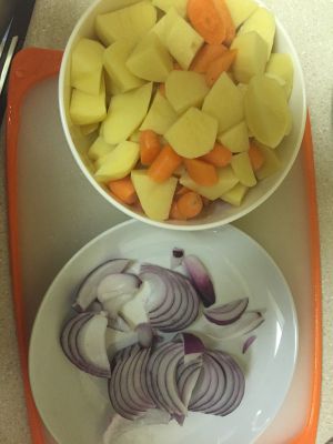 准备工作:洋葱切大块,土豆和胡萝卜切滚刀块,备用。将牛腩切小块(没有高压锅,只为少炖一会),锅中放清水,将切好的牛肉放进锅中,牛肉无血水后捞出后,再用清水将牛肉冲洗干净。