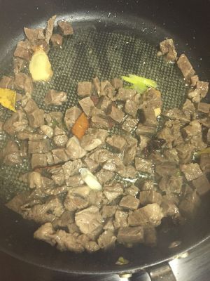 锅内少许油,锅烧热下姜片、八角翻炒下牛肉,放盐、糖,料酒、生抽翻炒后加水莫过牛肉