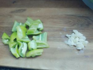 再用同样的刀法切成菱格网状,最后用滚刀切断。姜蒜切片。