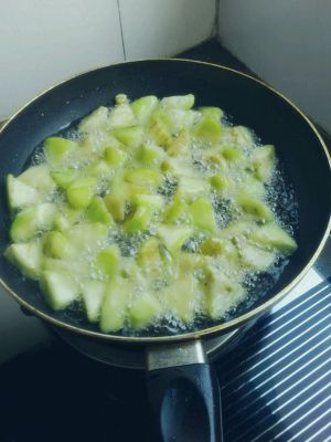 腌好的茄子倒掉水份用玉米淀粉抓均匀,色拉油入锅,油6成热放入茄子,煎炸金黄色捞出