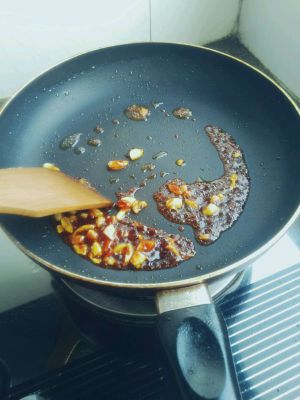 锅里烧油,油温六成热时下豆瓣、姜蒜、花椒爆香。再下茄子翻炒。