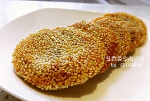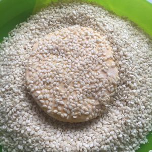 包好豆沙馅 放到白芝麻上按压 两面都要粘上满满的芝麻