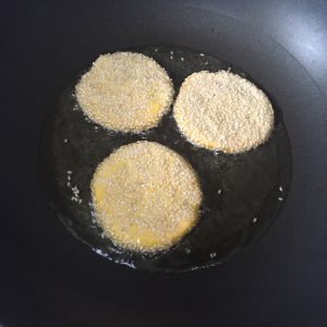 然后根据自己喜爱的甜度加糖,我个人喜欢南瓜的原味,所以没有加糖,整个过程中不需要加水,煮好的南瓜直接与糯米粉相拌,知道不粘手,然后压成饼状,粘上芝麻,在温温热的油力小火慢炸