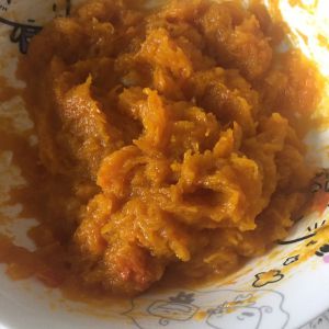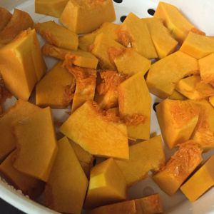 南瓜去皮洗净切块,放入锅中蒸10分钟,蒸熟捣成泥。