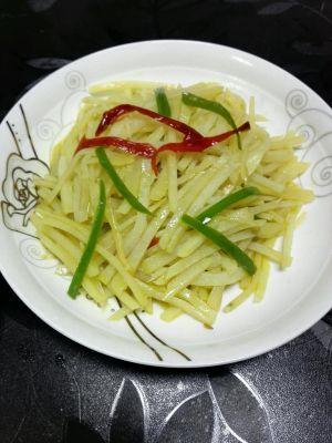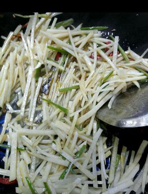 开火中火,如果不太有把握就小火.往锅中倒入油,稍微一热有点崩的时候放入葱花,用锅铲---小心崩着. 然后把在有洞洞的盆里的土豆丝抖搂抖搂,呼啦啦全倒进锅里. 用锅铲翻炒40秒钟左右,放入少许盐,如果你口味重点,就把盐均匀地撒在土豆丝上,然后继续翻炒.如果你口味轻点,就把盐在几个点撒一点,然后继续翻炒. 炒十下左右放入一点酱油,一点醋,酱油稍微多点,看起来是不是很有食欲呢?如果还嫌颜色没食欲,放点豆瓣酱也行,但是醋酱油就最好别放,要不然咸死你~~~吃多了盐不太好哦!血压会高滴! 快放淀粉和水吧!拿起备用的混合品(淀粉与水的混合均匀品),倒入一半在土豆上(一定要在土豆上,倒在锅上马上就粘稠成做糖葫芦的糖啦!)翻炒几下再倒入剩下的"淀粉水".再放点黑胡椒,拧碎了均匀撒上,对了,别忘了拿根筷子,把粘在锅铲上的土豆丝扒拉下来,否则铲子上面的土豆丝什么调料也没沾上很难吃哦~~呵呵.如果喜欢有点辣味的,就放点洗净切条的青椒辣椒吧!
