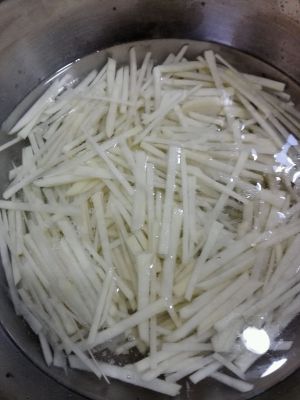土豆丝淘洗两遍,泡在清凉水中(主要是为了去出淀粉),炒之前捞起沥干水分。