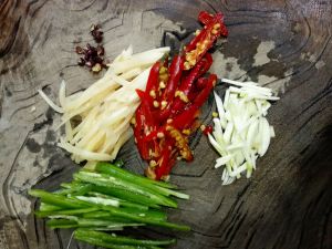 泡红辣椒,泡姜,蒜,青辣椒都切成丝,花椒备齐